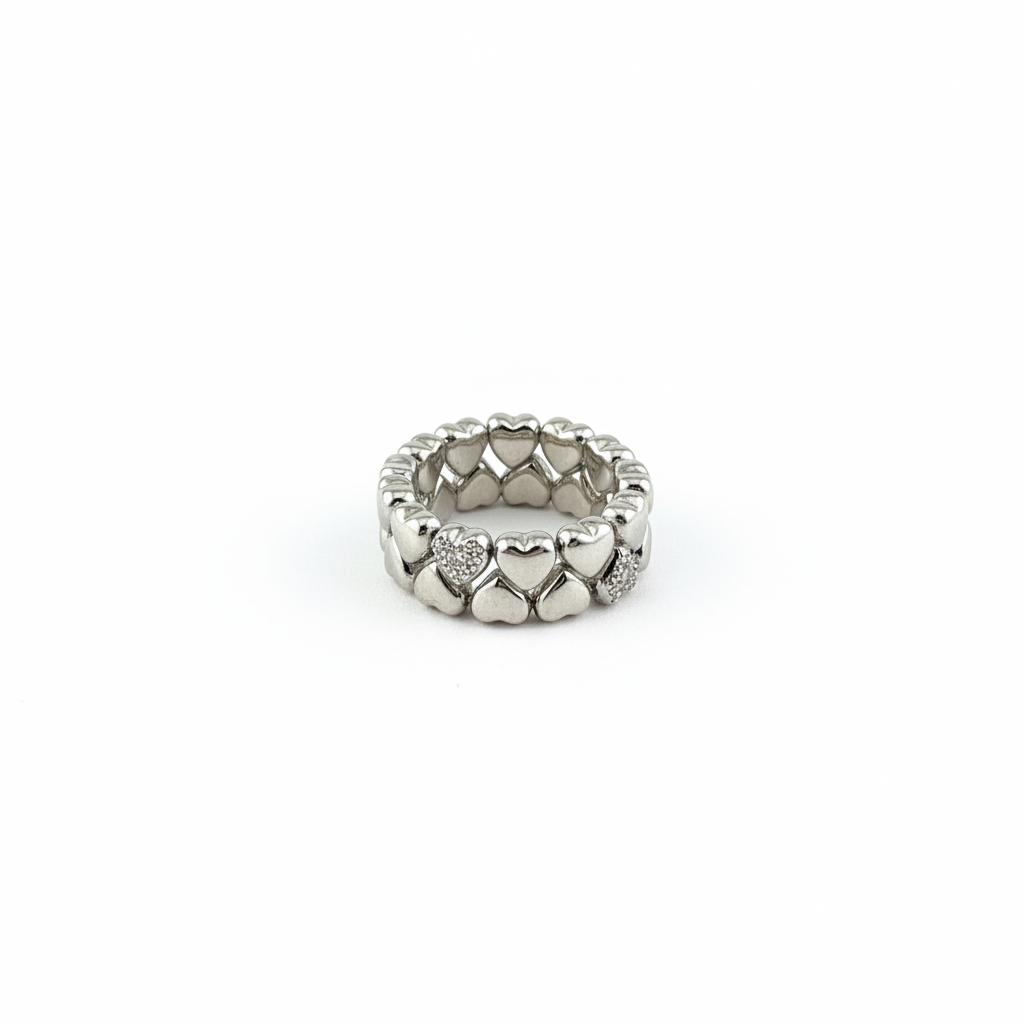 Anello elastico con molla interna, composto da una fila continua di piccoli cuori in rilievo, comodo da indossare e perfetto per aggiungere un tocco romantico e giocoso al look.