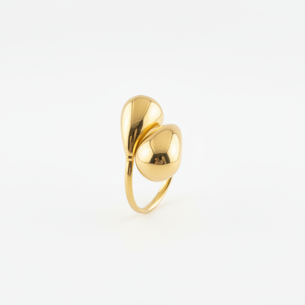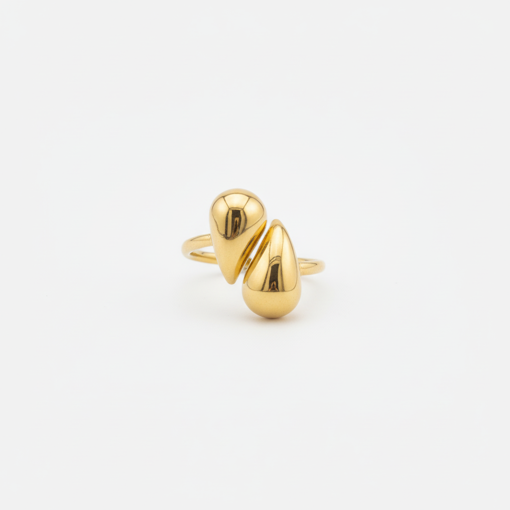 Questo anello aperto dal design minimale avvolge delicatamente il dito con due estremità levigate a goccia che sembrano sfiorarsi, creando un effetto di equilibrio perfetto tra vuoto e pieno.