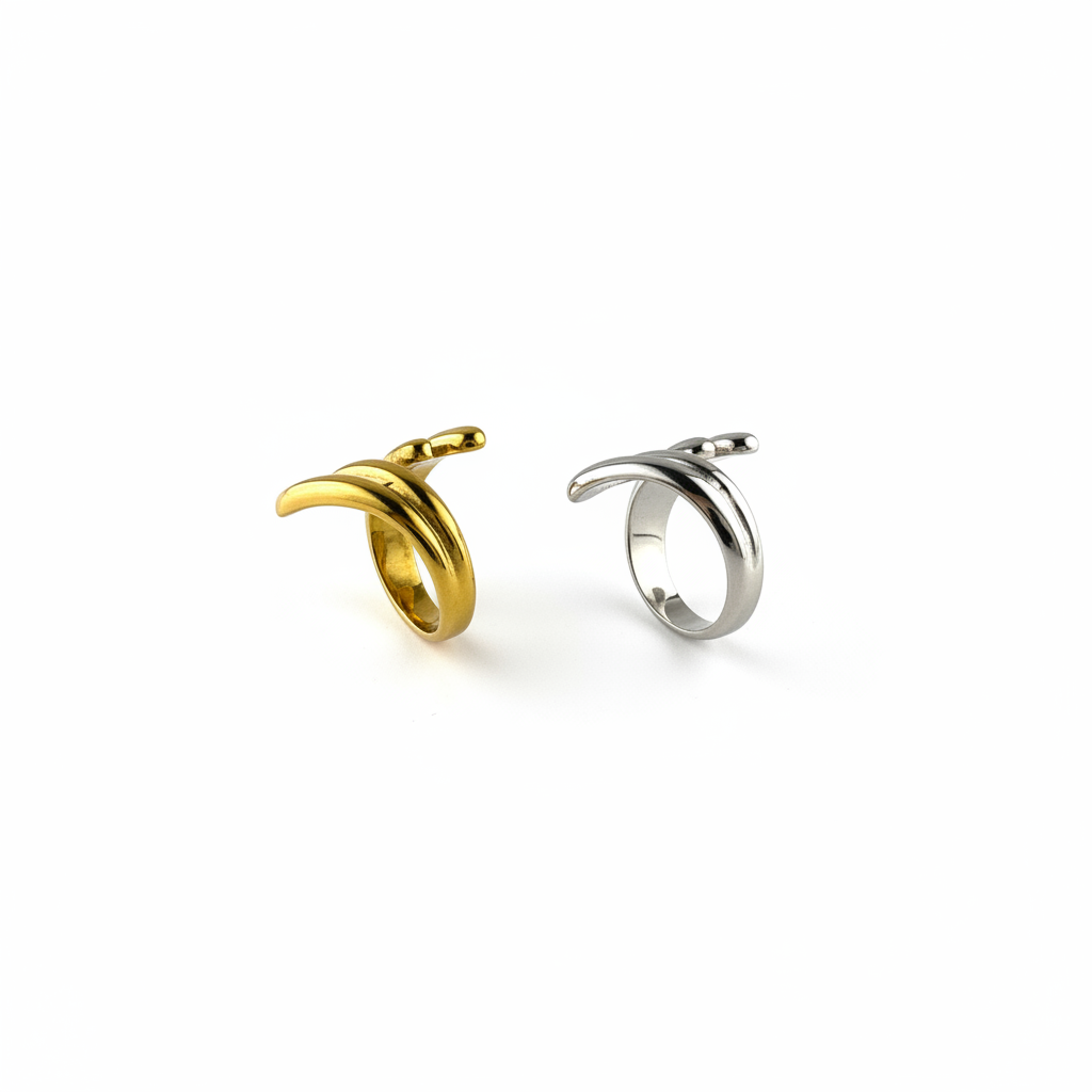 Disponibile in due varianti – oro lucido dal carattere caldo e deciso, e argento specchiato dal look essenziale e moderno – è un design minimal ma scultoreo, perfetto sia da solo che abbinato ad altri anelli per creare giochi di volumi e contrasti di colore.