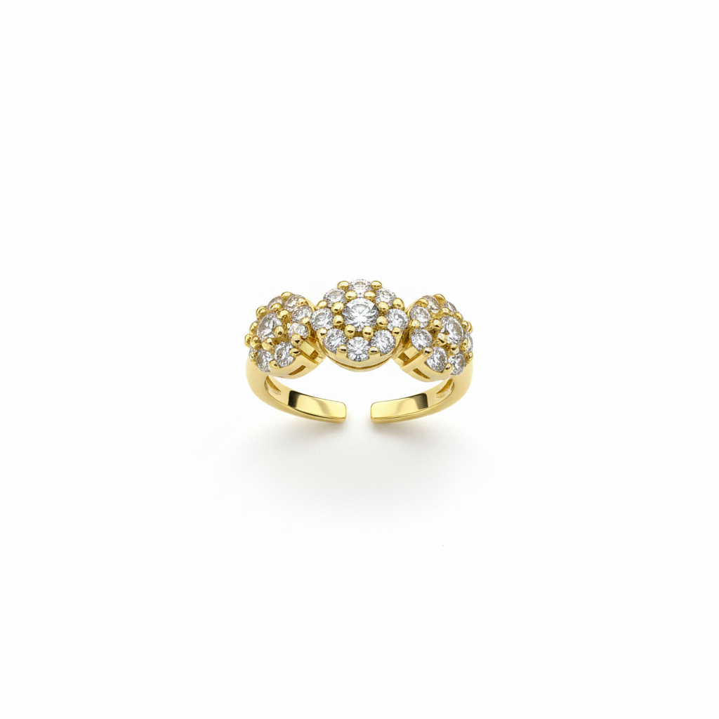 Anello regolabile dorato con tre elementi rotondi a pavé di cristalli, che ricordano piccoli bouquet luminosi, perfetto per chi ama un effetto scenografico ma comunque elegante sulle mani.