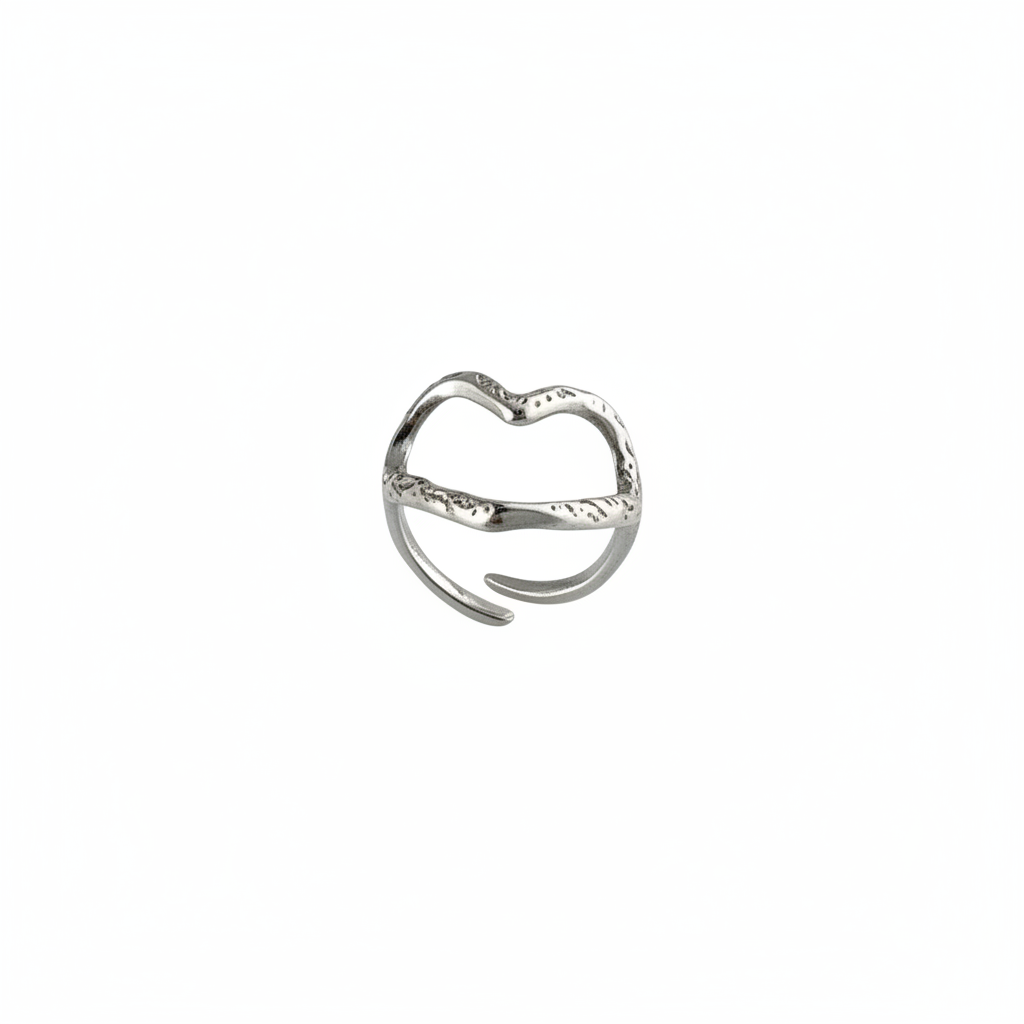Anello regolabile con cuore aperto dal profilo irregolare e lavorazione martellata, disponibile in finitura argento o dorata, che unisce stile artigianale e design moderno per un effetto leggero ma di carattere.