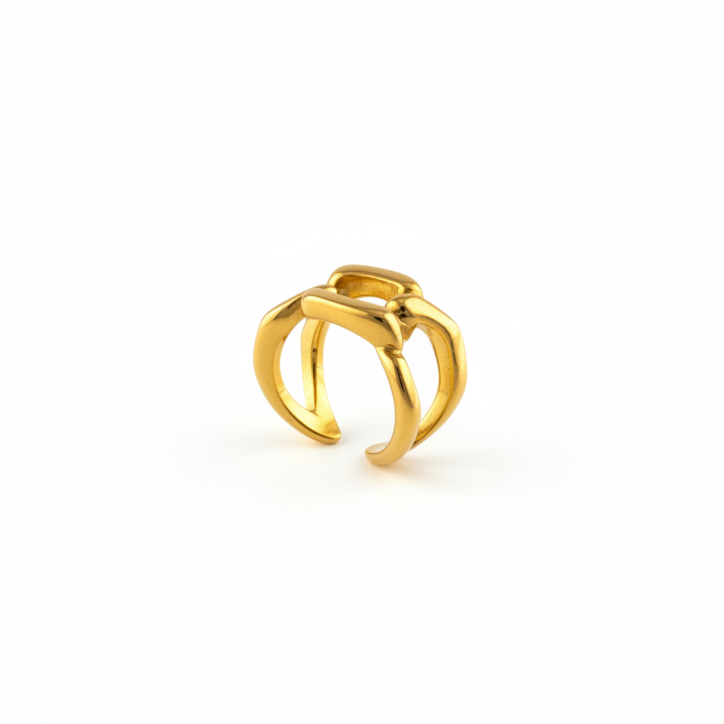 Anello regolabile dorato con doppia fascia aperta e piccolo ponte centrale, dal profilo essenziale ma deciso, ideale per aggiungere un tocco grafico e contemporaneo a qualsiasi look.