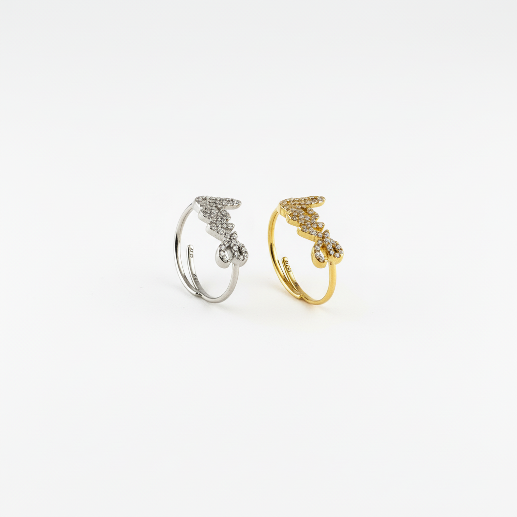 Anello regolabile in acciaio inox disponibile in versione dorata e argentata, con dettaglio a piccole ali ricoperte di zirconi che formano un elegante motivo “Love” stilizzato. Sottile ma super luminoso, è perfetto da indossare ogni giorno come simbolo di amore leggero e libero, da solo o in stacking con altri anelli minimal.