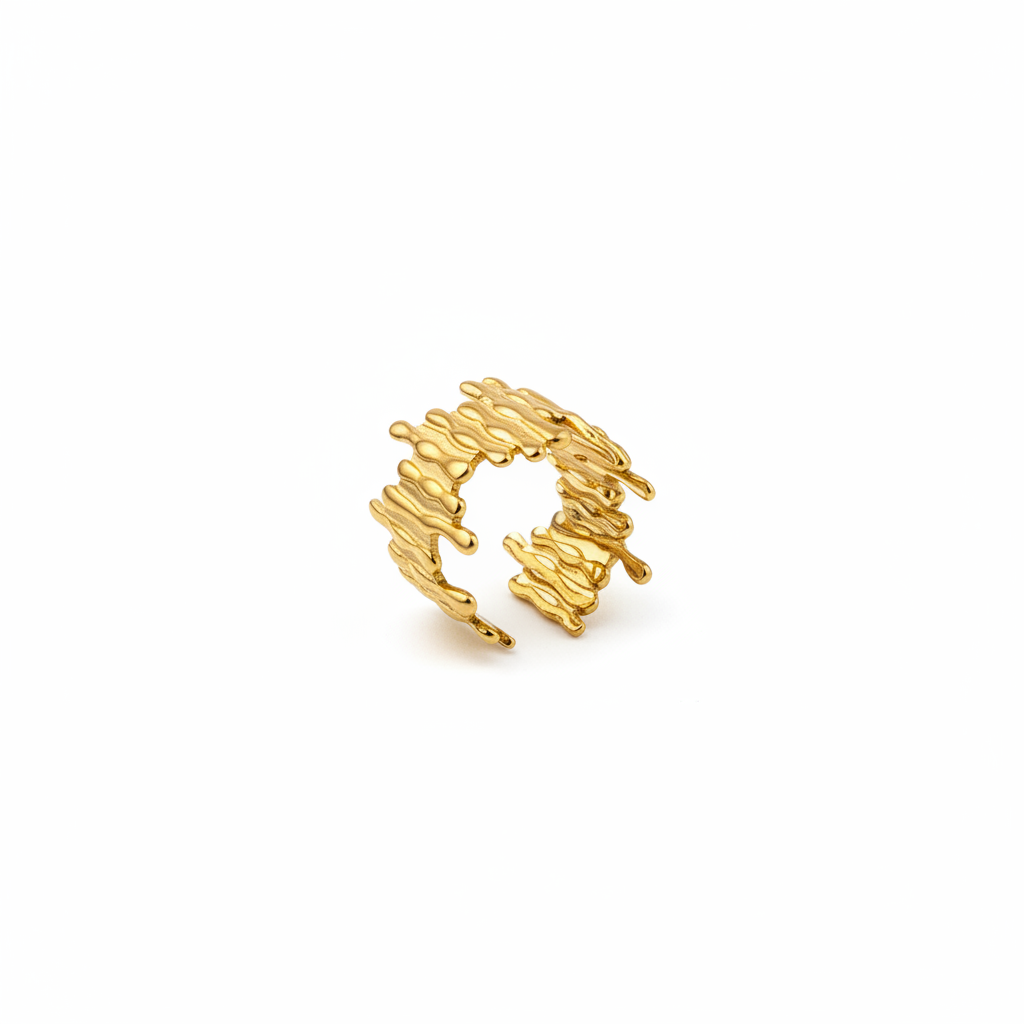 Anello regolabile dorato a fascia con elementi ondulati irregolari che ricordano piccole colate di metallo fuso, ideale per chi cerca un gioiello artistico e moderno ma facile da abbinare.