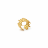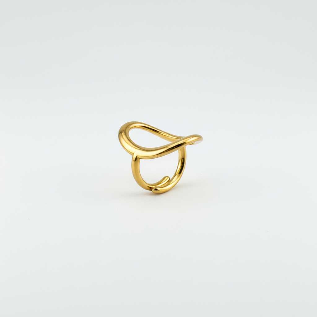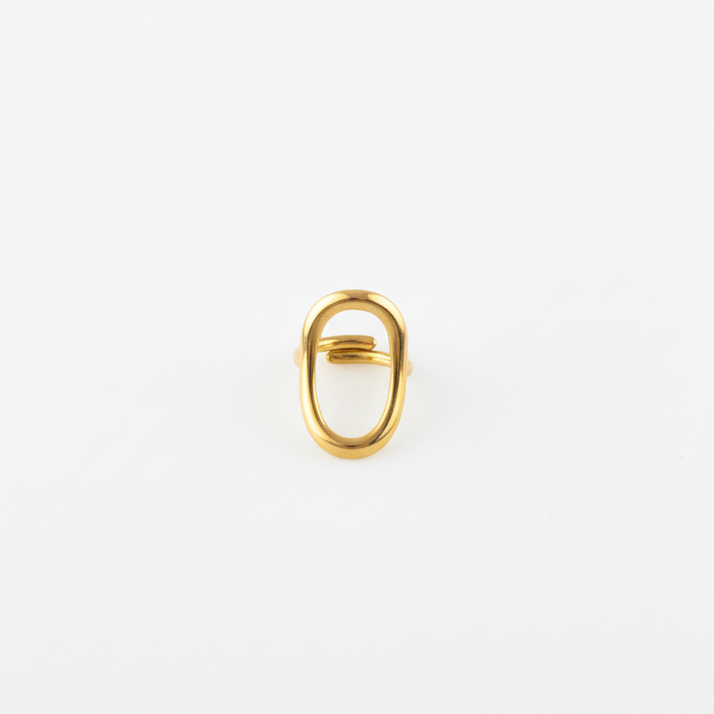 Anello dorato con grande profilo ovale vuoto e gambo che attraversa il centro, creando un effetto “cornice” sospesa sul dito, essenziale ma super contemporaneo.