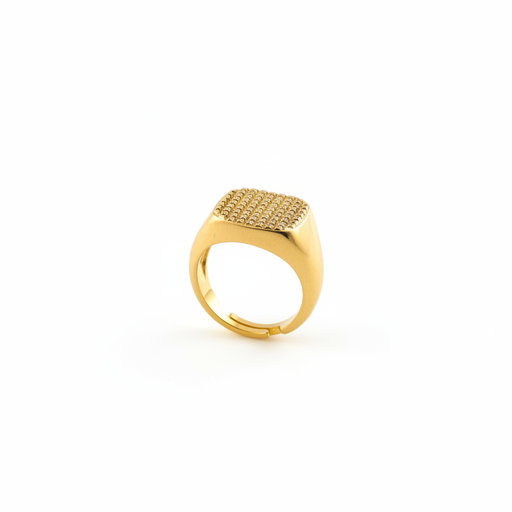 Anello regolabile dorato con placca quadrata ricoperta da micro-cristalli in pavé tono su tono, che crea un effetto scintillante ma raffinato, ideale per dare un tocco glamour anche ai look più semplici.