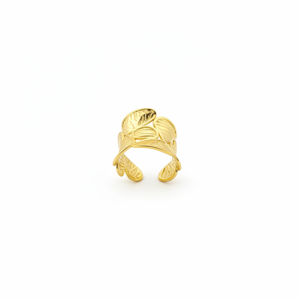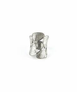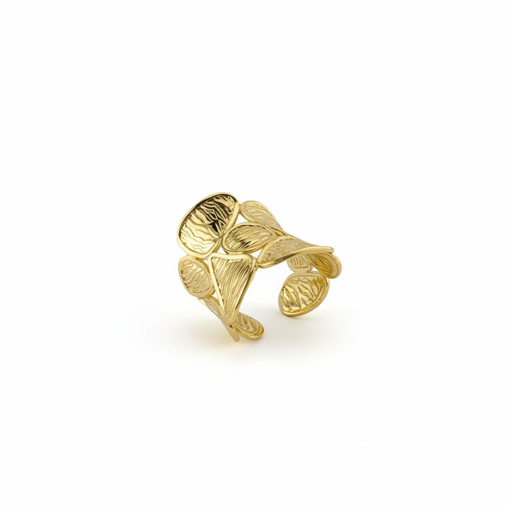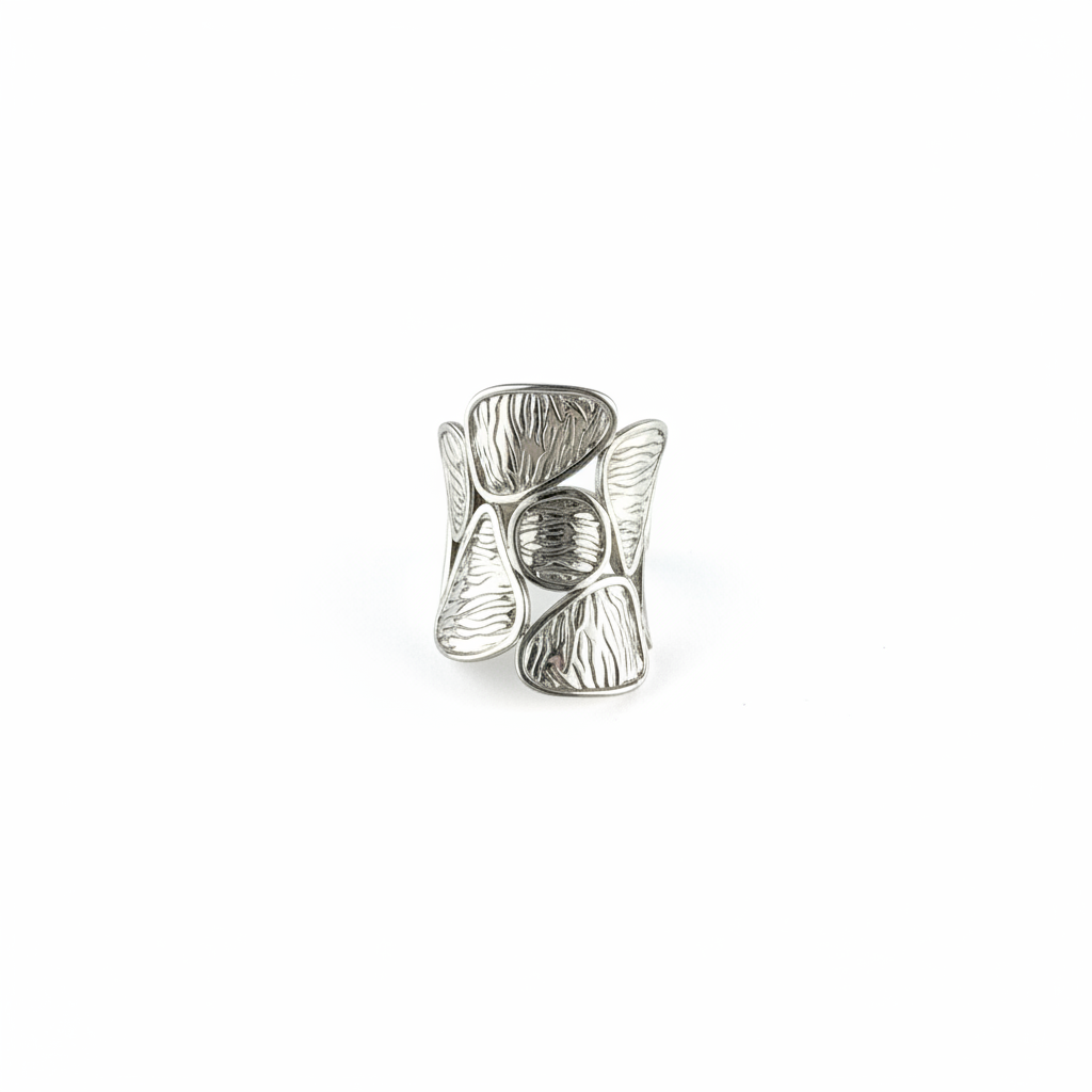 Anello a fascia larga in finitura argento o oro con elementi irregolari effetto scaglia, ispirato alle superfici lunari e perfetto per chi ama i gioielli importanti e artistici.