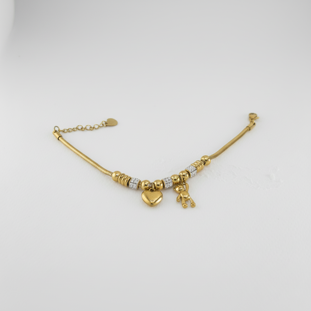 Bracciale tipo snake in acciaio inossidabile con finitura dorata e charm centrali decorati da cristalli luminosi. Al centro spiccano due ciondoli pendenti, un cuore e un tenero orsetto, simboli di affetto e dolcezza, ideali come regalo per una persona speciale; la chiusura regolabile assicura una calzata sicura e adatta a diversi polsi.