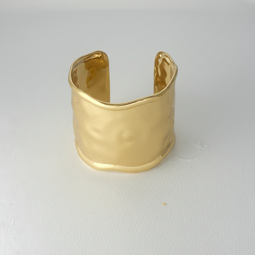 Bracciale rigido a polsino in acciaio inox dorato, caratterizzato da una banda ampia e leggermente ondulata che avvolge il polso come una vera lama di luce. La superficie lucida e irregolare crea riflessi dinamici ad ogni movimento, rendendolo un pezzo statement perfetto per trasformare anche il look più semplice in qualcosa di super chic.