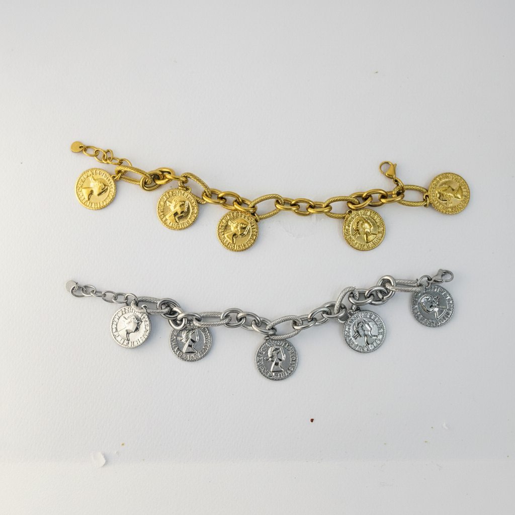 Bracciale a catena con ciondoli a moneta dallo stile antico, disponibile in versione dorata o argentata, perfetto per dare un tocco deciso e luminoso ad ogni look.