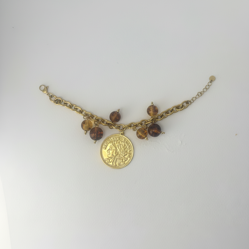 Bracciale dorato con grande medaglia centrale e perle effetto ambra pendenti, dal carattere vintage e raffinato, pensato per valorizzare il polso con un dettaglio caldo e sofisticato.