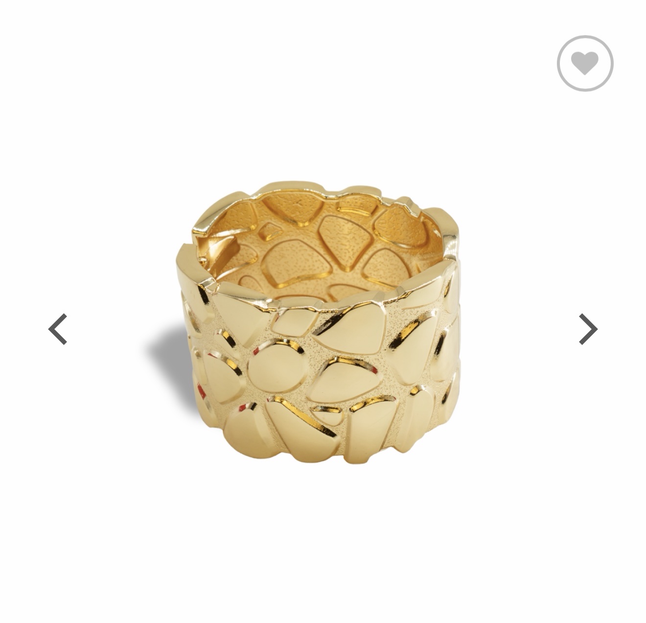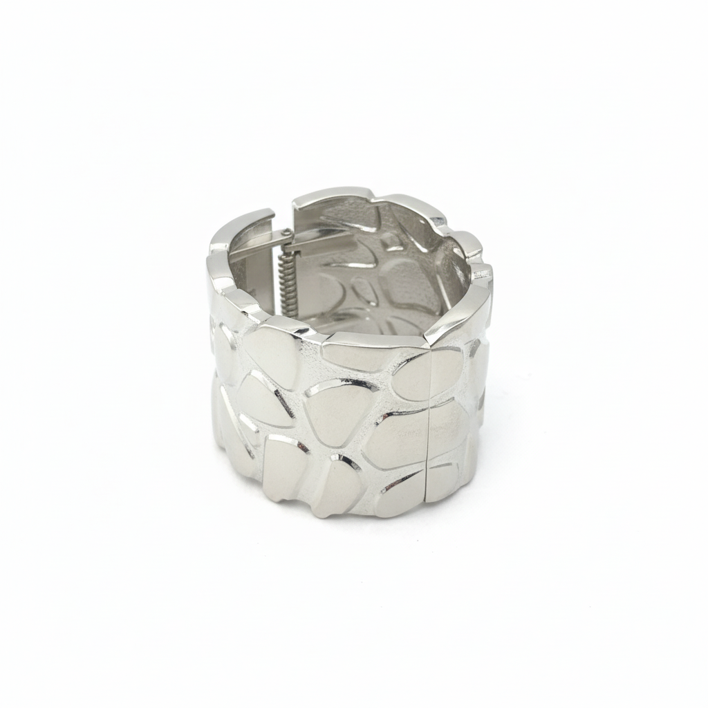 Bracciale rigido in acciaio inox argentato dalla banda ampia, caratterizzato da una texture irregolare che ricorda scaglie luminose o crateri lunari in versione ultra chic. La finitura brillante e il design strutturato lo rendono un pezzo statement perfetto per chi ama accessori bold e moderni, capace di trasformare all’istante qualsiasi outfit.
