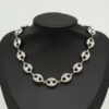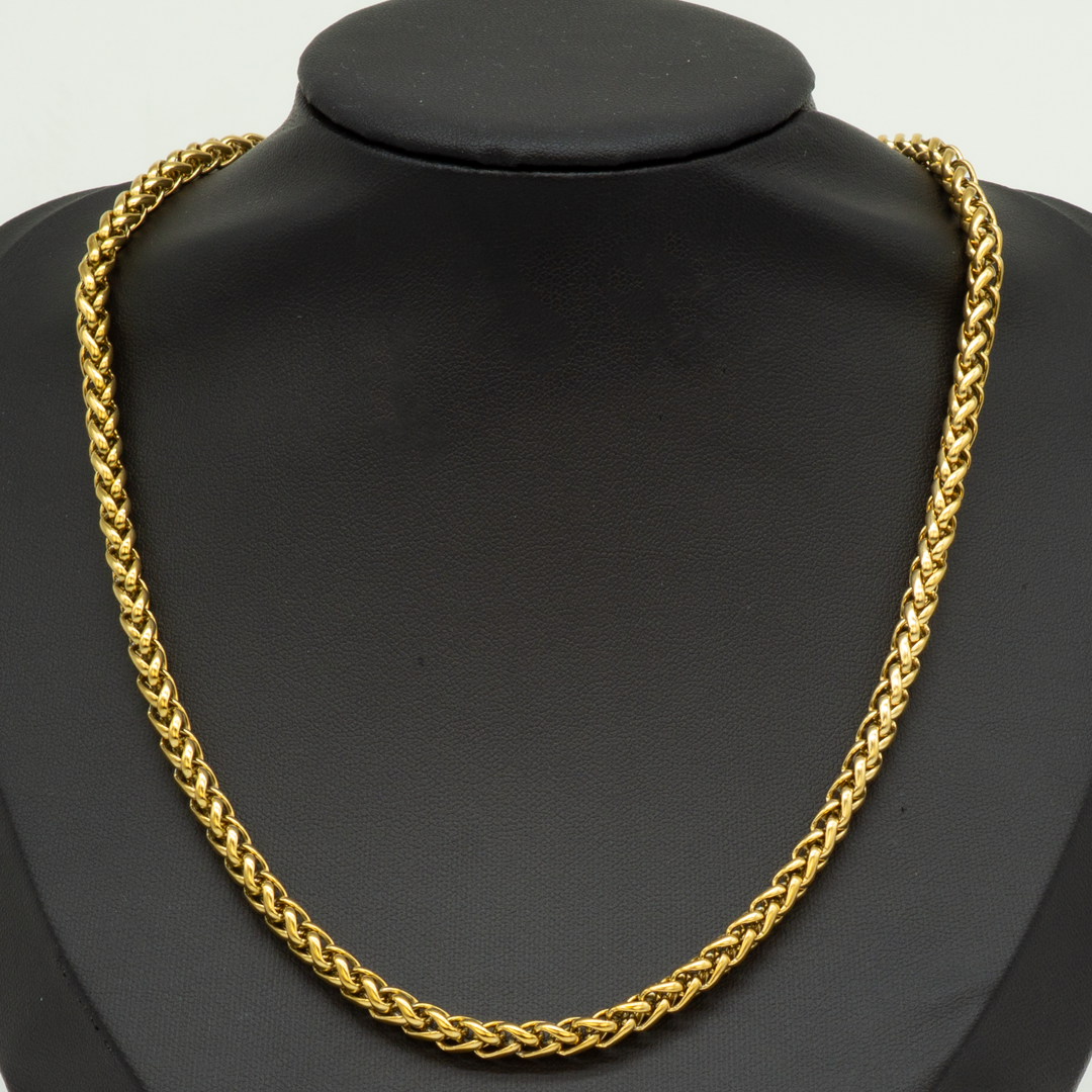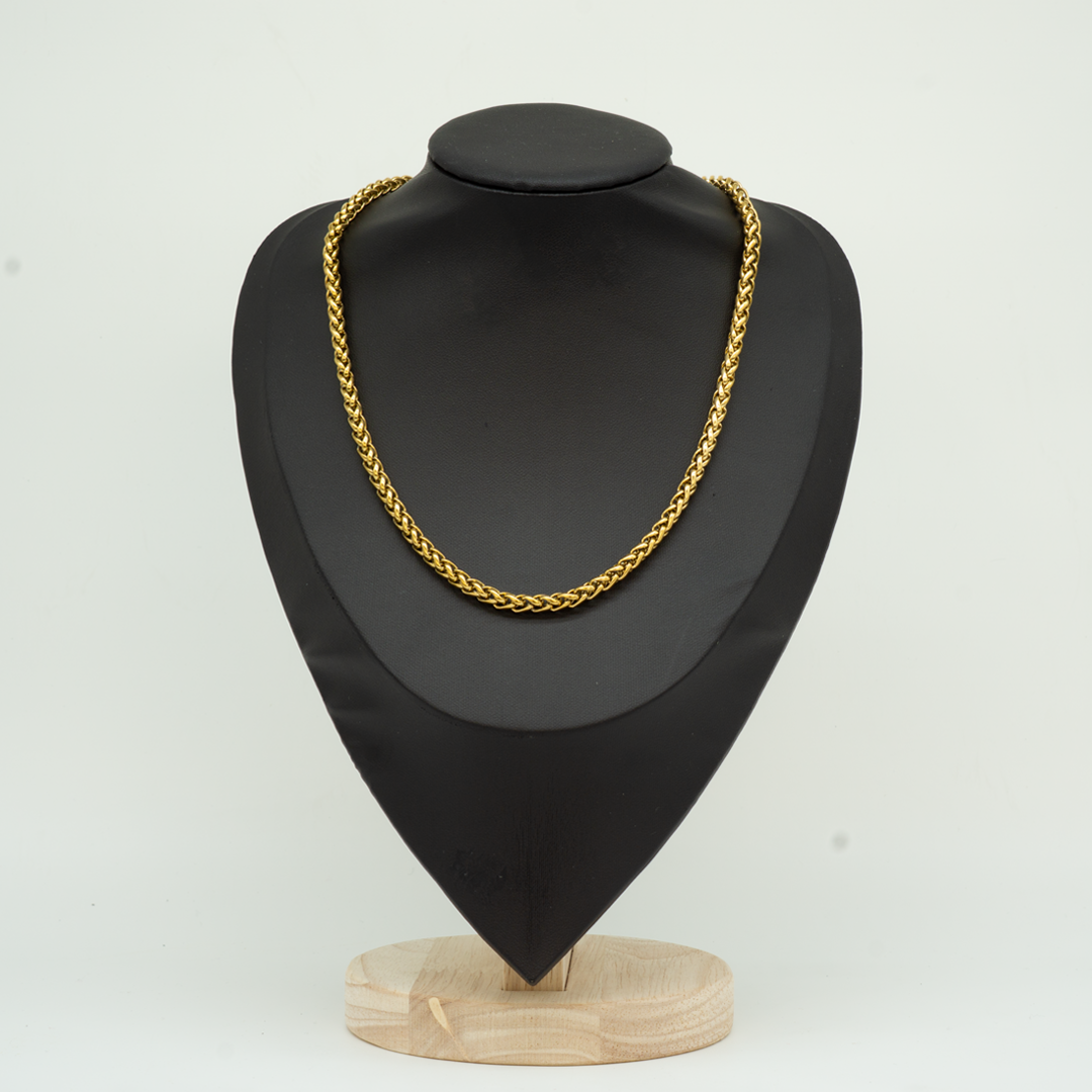 Una collana color oro dal design riccamente intrecciato, che unisce luminosità e carattere in un unico gioiello. Le maglie, sapientemente lavorate, si avvolgono tra loro creando un pattern fluido e sofisticato, capace di catturare la luce da ogni angolazione. Perfetta per chi ama accessori importanti ma raffinati, questa collana aggiunge un tocco di eleganza senza tempo a qualsiasi look.