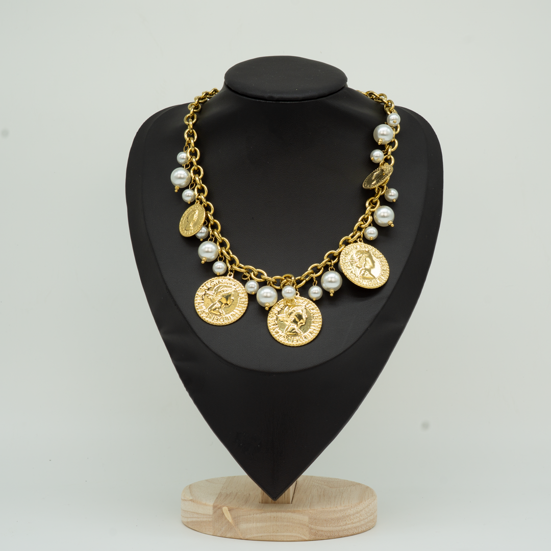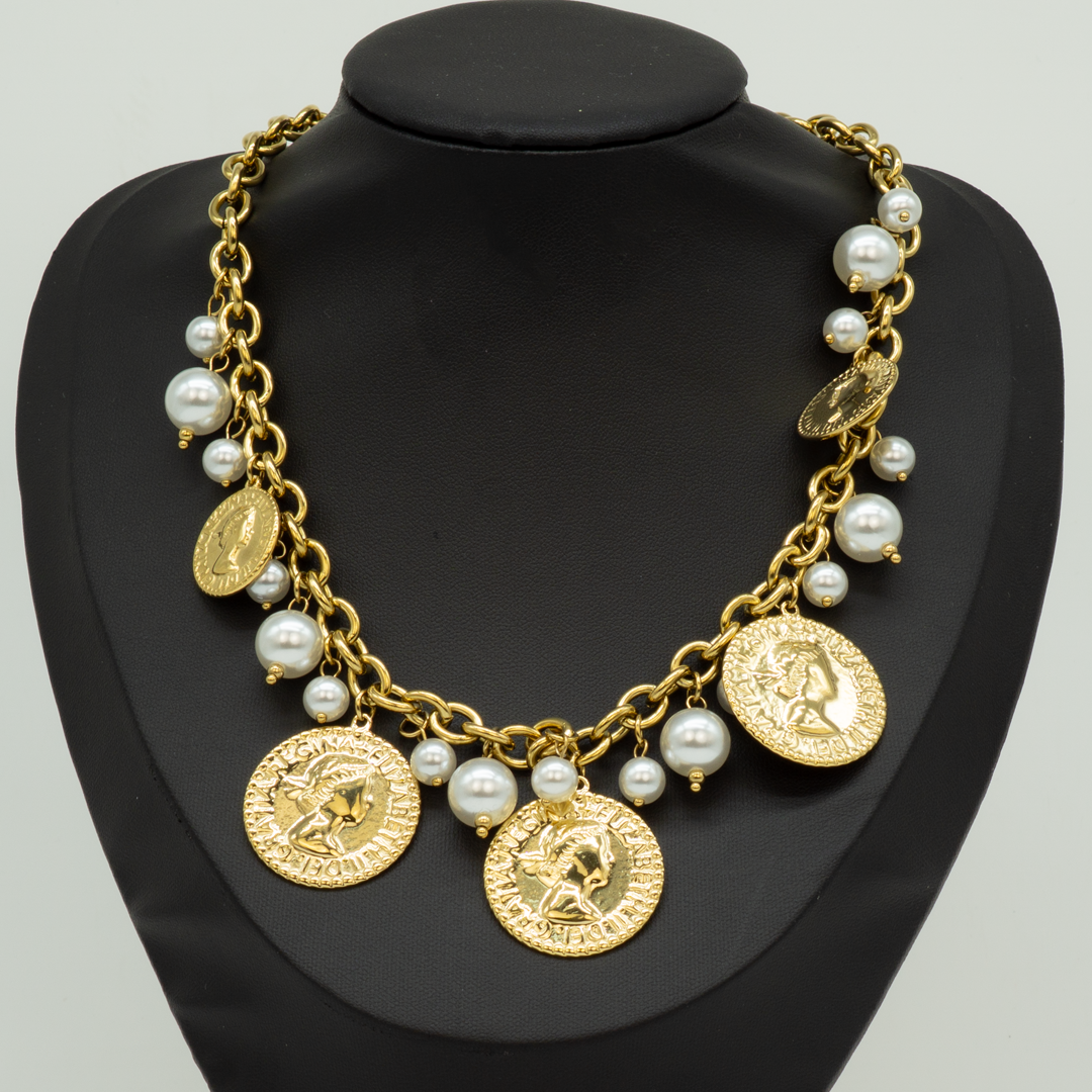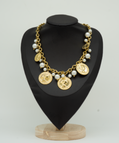 Collana dorata con medaglia pendente e perline colorate. Perfetta per aggiungere un dettaglio chic e discreto al collo, ideale da sola o in layering.