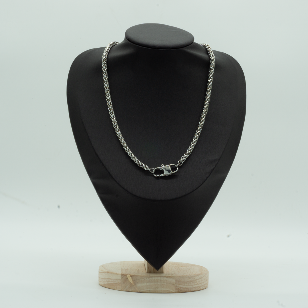 Collana a catena intrecciata in acciaio color argento, dal design moderno e deciso, ideale da indossare tutti i giorni.