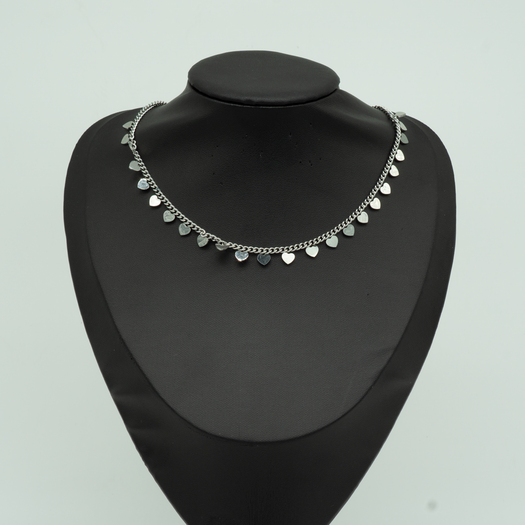 Una collana dolce e luminosa, arricchita da una sequenza di piccoli cuoricini che creano un effetto delicato e romantico. Il design leggero e armonioso aggiunge un tocco di femminilità a qualsiasi look, rendendola perfetta da indossare ogni giorno o da regalare a qualcuno di speciale. Un gioiello semplice ma significativo, capace di illuminare ogni outfit con eleganza e dolcezza.
