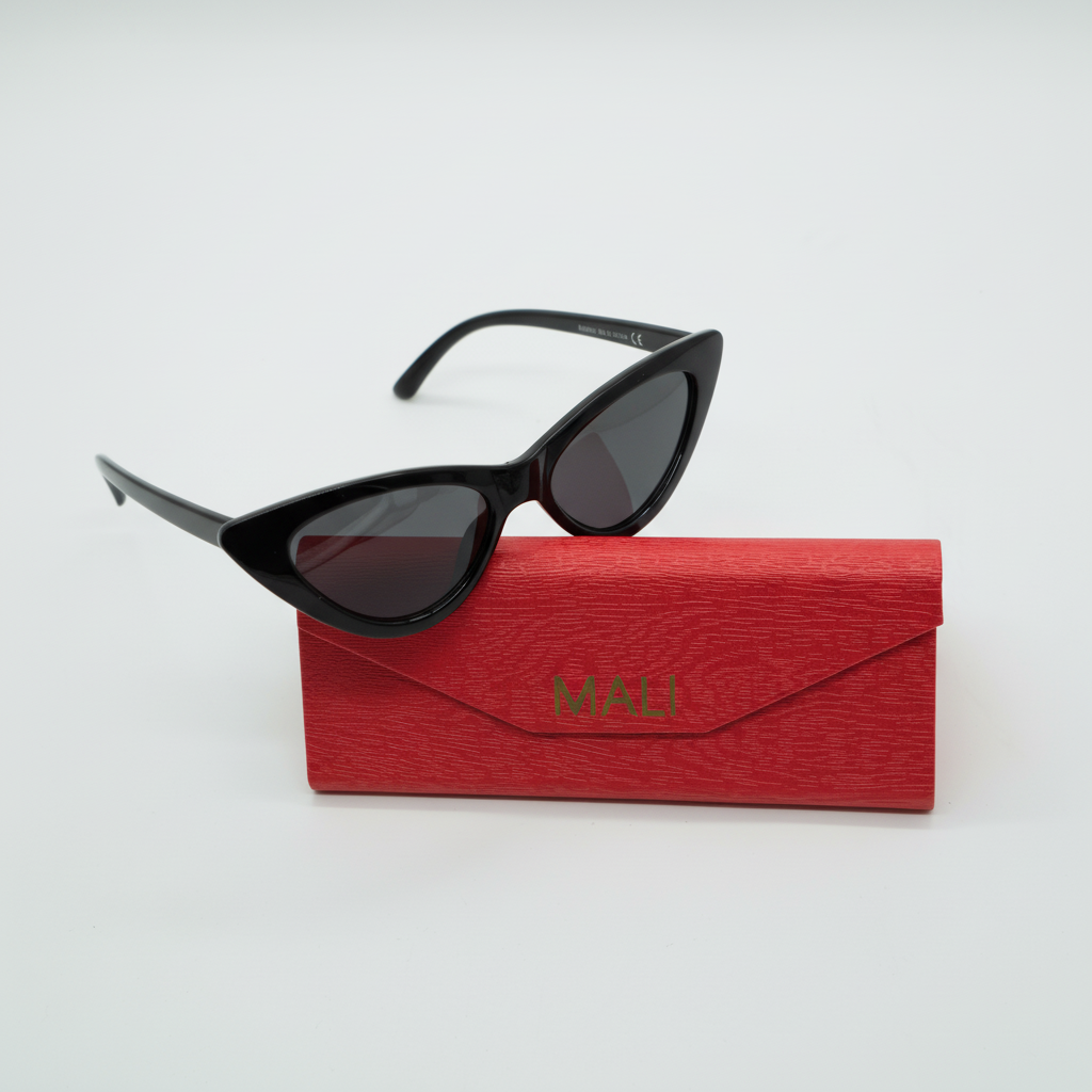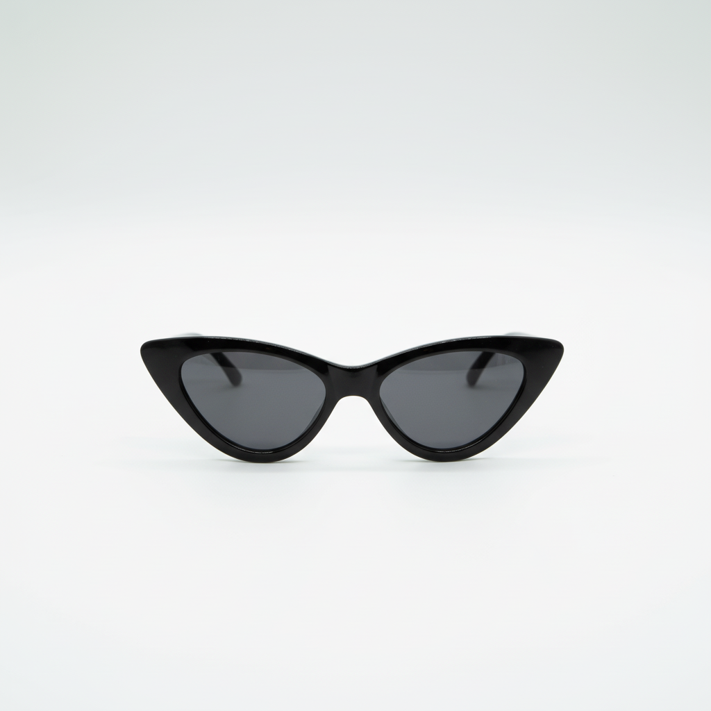 Occhiali da sole cat-eye in acetato nero lucido, dal design deciso e super femminile. Le lenti nere donano un effetto misterioso e glamour, perfetti per valorizzare qualsiasi outfit.
