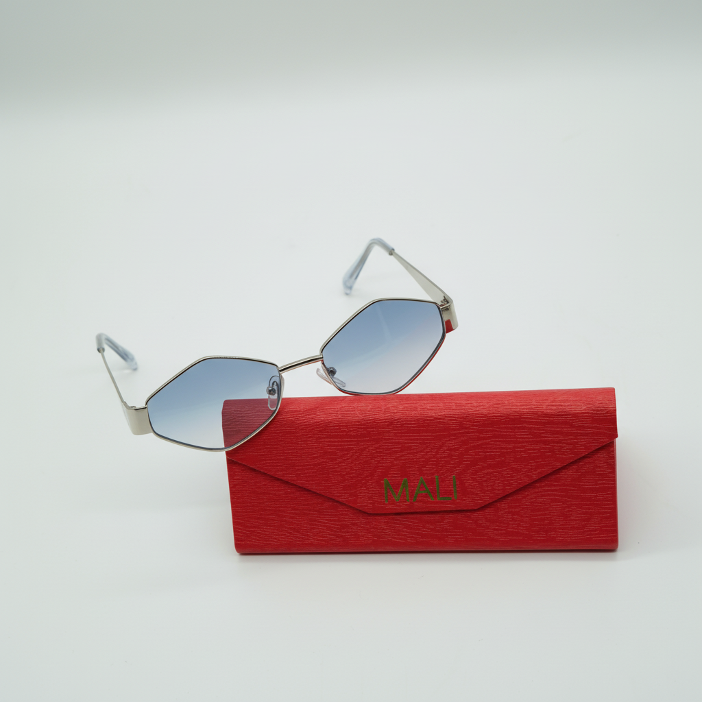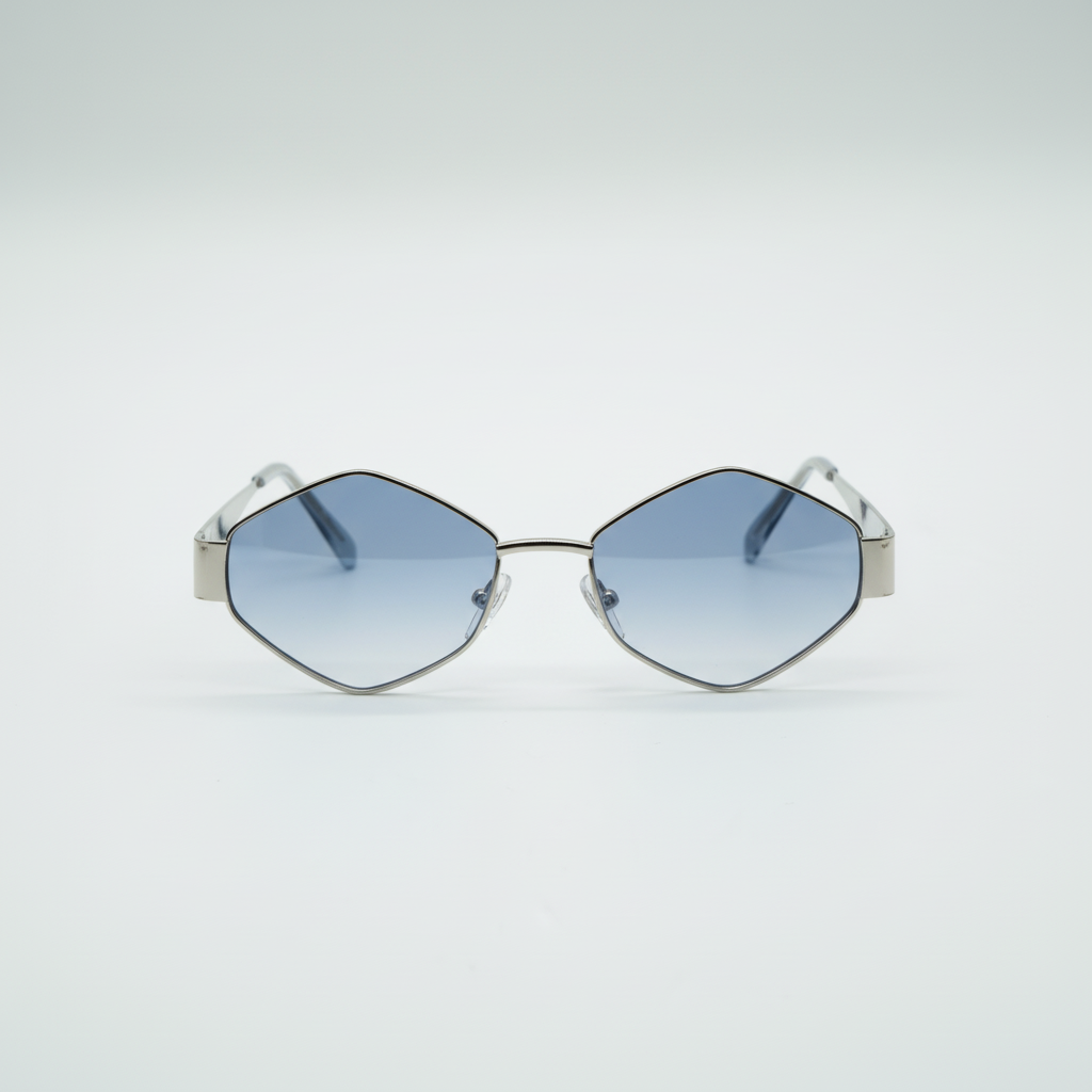 Montatura metallica esagonale color argento con linee sottili e moderne. Le lenti blu sfumate alleggeriscono lo sguardo e donano un look fresco e sofisticato, perfetto per tutti i giorni.