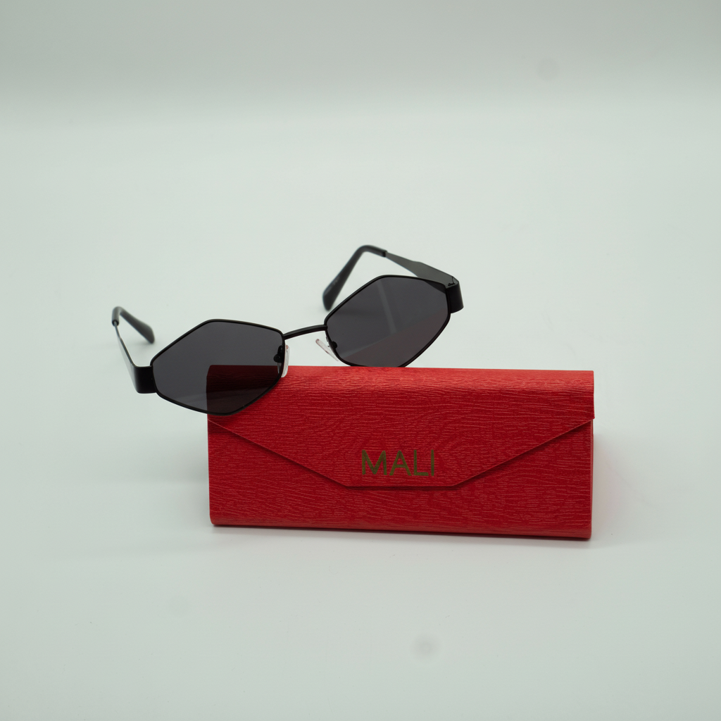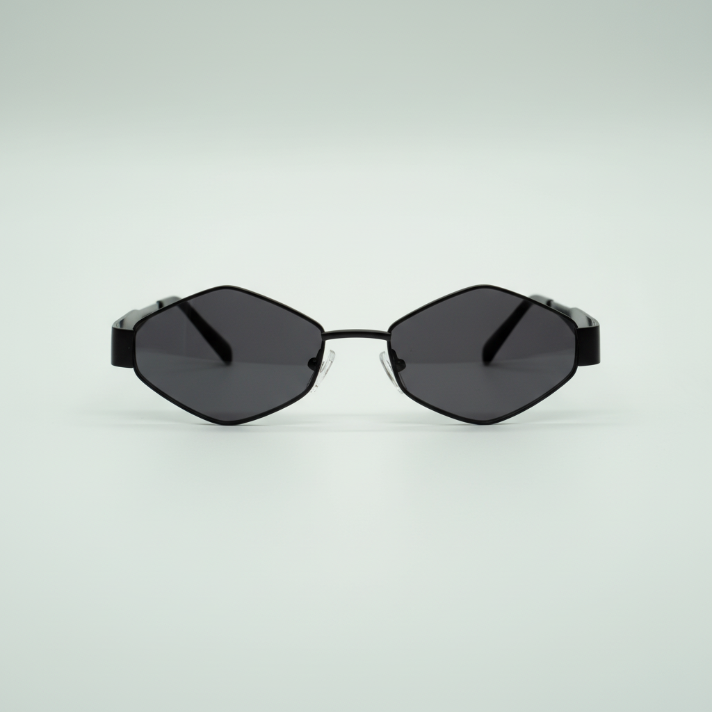 Montatura metallica esagonale nera con aste spesse e linee geometriche decise. Le lenti nere scure creano un effetto total black, ideale per uno stile urbano e contemporaneo.