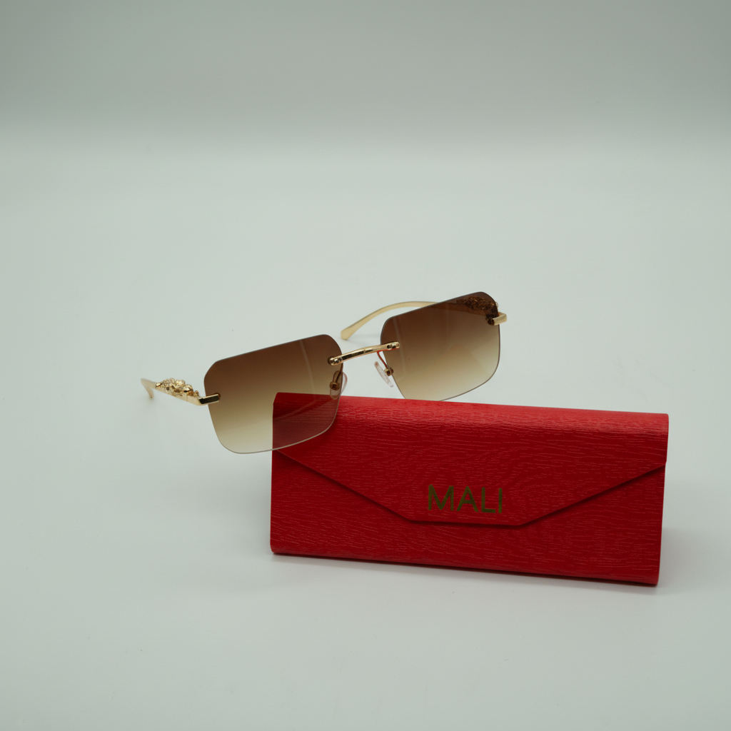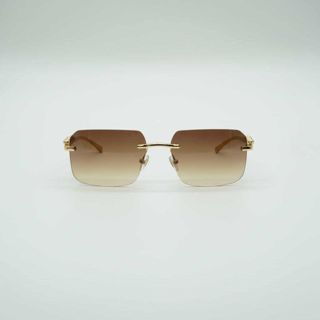 Occhiali da sole senza montatura con lenti quadrate marrone sfumato, sostenute da delicati dettagli dorati. Un modello elegante e luminoso, ideale per aggiungere un tocco raffinato a qualsiasi look.