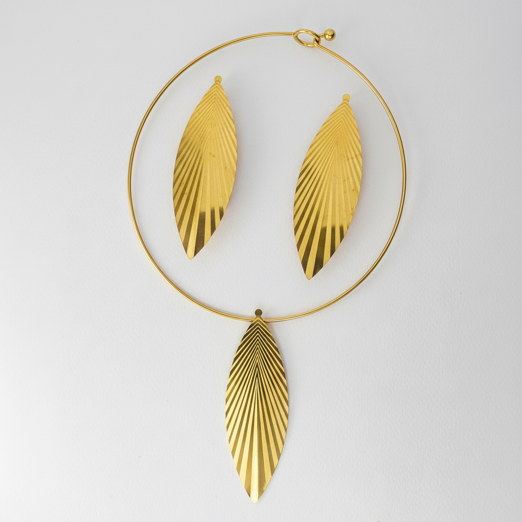 Set di collana e orecchini in acciaio inox dorato dal design elegante e contemporaneo, caratterizzato da ciondoli a foglia allungata con incisioni a raggiera che esaltano la lucentezza del metallo. L’acciaio inox assicura resistenza, colore duraturo e assenza di scolorimento, rendendo questo set ideale per un uso quotidiano e per completare con stile sia outfit minimal che look da sera.